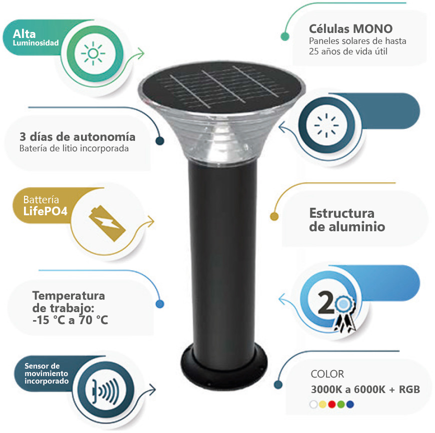 Nuestra farola solar tipo pilona es el producto perfecto para jardines, parkings, veredas, etc. Disponemos de tres modelos: ARKO, HADES y ARES. ARKO es una pilona solar con un grado de resistencia IK10 y una cubierta de policarbonato sobre el panel solar para proteger de manera eficiente el solar contra los golpes, con un nivel IK10+ de resistencia a los impactos. La curvatura de la cubierta evita que el polvo se acumule, eliminándose fácilmente con la lluvia.