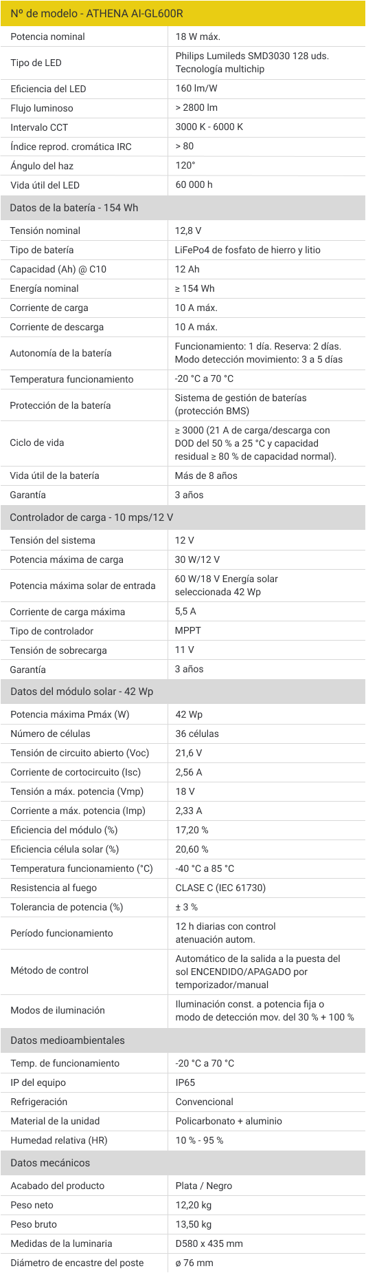 Athena combina una estética de líneas sencillas con la última tecnología en baterías de litio, paneles solares y un sistema de control inteligente. El uso de paneles solares de alto rendimiento de 42 W y reguladores de carga solar MPPT garantizan la suficiente generación de energía eléctrica diaria para un funcionamiento estable y sin interrupciones durante todo el año. La potencia de iluminación y el tiempo de funcionamiento pueden regularse fácilmente mediante el mando a distancia gracias a los programas de iluminación incorporados. La farola incorpora un sistema de detección de movimiento que permite ahorrar energía. Athena es la farola solar perfecta tanto para los países del sur, con 5,5 horas efectivas de sol, como para el norte de Europa, con tan solo 2,5 horas.
