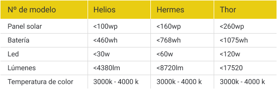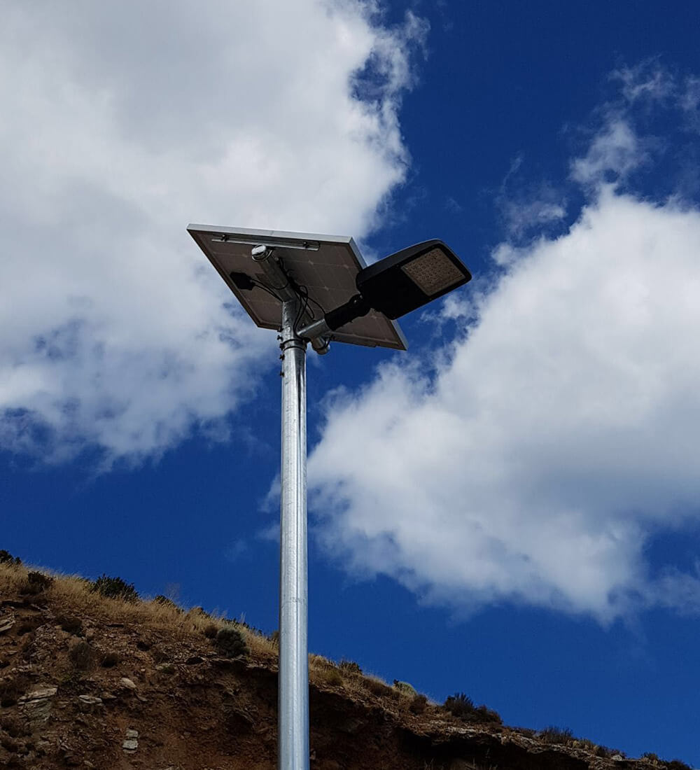 Nuestra gama de farolas solares «All in Two» se ha diseñado para proporcionar una elevada luminosidad efectiva y continua en proyectos de alto nivel. A diferencia de las farolas solares todo en uno, el panel solar de los sistemas todo en dos está separado del cabezal de la farola y ambas partes están conectadas entre sí mediante conectores universales MC4. El paquete de baterías LifePO4 de gran tamaño, con autonomía de entre dos y tres días, y el regulador de carga MPPT están integrados en el interior de la farola. Tenemos tres modelos a su disposición; el HELIOS, para instalaciones de 20 W, 30 W y 50 W; el HERMES, de 60 W y 80 W, y el THOR, de 100 W y 120 W. Todas las especificaciones se pueden personalizar según los requisitos del cliente.