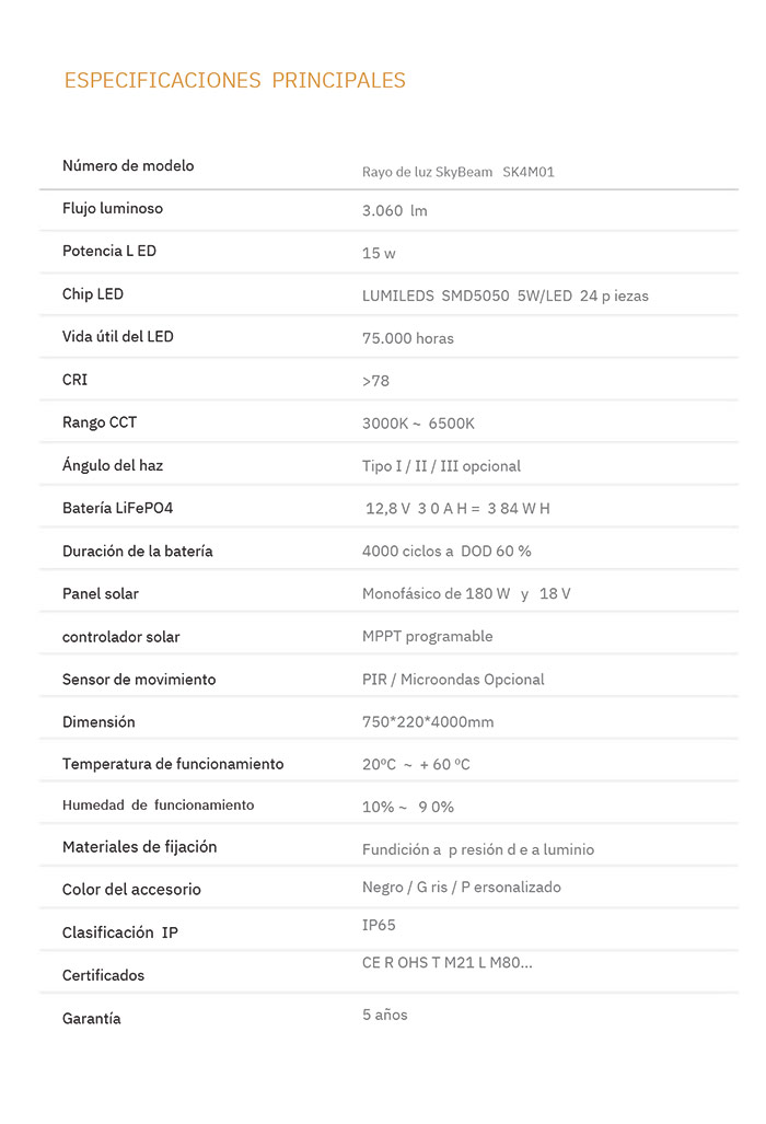 Nuestros postes de iluminación solar cuentan con robustas carcasas de aluminio fundido a presión y un diseño elegante y aerodinámico, diseñados para proyectos de alta gama. Cuentan con paneles solares de alta potencia, gran capacidad de funcionamiento y una garantía de 5 años que garantiza su excepcional calidad y durabilidad.